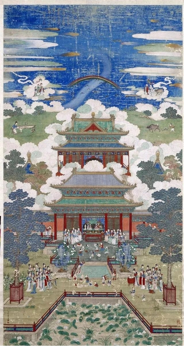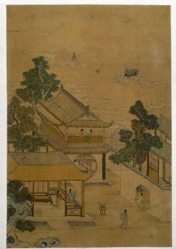 “七夕乞巧图”是中国节令绘画的重要题材。现存最早的《乞巧图》绘制于五代,发展至明清,已形成了高楼宫苑、穿针引线、供奉瓜果、祭拜织女的绘画母本。收藏于故宫博物院的清代缂丝《七夕图》,通过娴熟的缂丝技法,形象地再现了七夕乞巧场景。画面共分为天上、凡间两部分,上方天际广袤而静谧,牵牛郎骑坐神牛,织女长裙飘曳,二人驾乘祥云,遥相呼应。下方的画面则展示了尘世间鲜活与生机:绿木掩映的庭院,高高的楼阁上二女子正在收取白日暴晒的衣物;右侧圆月门边,一女子端一水盆,似准备投针于水;庭院正中设几案,上置乞巧果子之类的供奉物品,女子伫立在旁;左侧小亭中二女子举臂抬首对月穿针,静心凝视尽显虔诚之态。