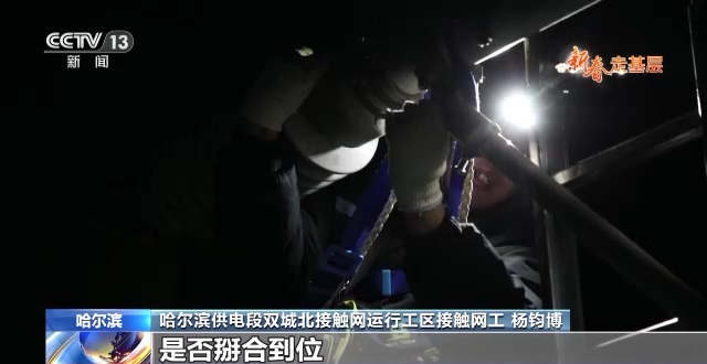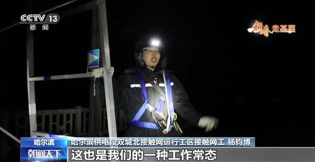 记者:怎么样?今天这个作业强度大不大?哈尔滨供电段双城北接触网运行工区接触网工 杨钧博:冬天咋说呢,这也是我们的一种工作常态,我们最怕的就是像去年那一场冻雨,那个时候接触网上全是冰溜子,我们的热滑车滑过去,冰也是下不去,只能用人工去打,那个时候的工作量是非常大的。