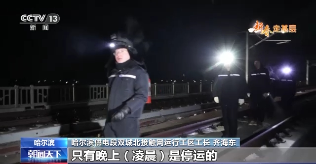 哈尔滨供电段双城北接触网运行工区工长 齐海东:我们工作时间大部分在凌晨的零点半到4点半,因为高铁白天车辆运行密度大,只有晚上(凌晨)是停运的,每年这个时候都是我们最繁忙的时候。