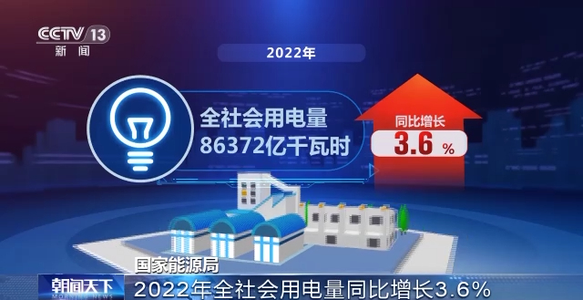 国家能源局昨天(18日)发布数据,2022年,全社会用电量86372亿千瓦时,同比增长3.6%。分产业看,第一、二、三产业用电量同比分别增长10.4%、1.2%和4.4%,城乡居民生活用电量同比增长13.8%。
