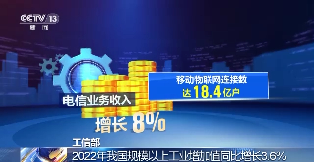 在国新办昨天(18日)举行的新闻发布会上,工信部发言人介绍了2022年工业和信息化发展情况。2022年,我国规模以上工业增加值同比增长3.6%;高技术制造业增加值同比增长7.4%,高于制造业增加值增速4.4个百分点;电信业务收入增长8%,移动物联网连接数达18.4亿户。