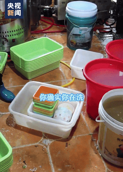 盛放食物的塑料筐、用过的餐盘随地堆放,餐具设施设备上面布满污垢……