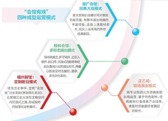 “会馆有戏”的首发地湖广会馆是全国会馆文化运营的成功代表。自1996年修缮一新后,这里一直是京剧表演的重要场所,名声在外。近年来,沉浸式演出“遇见湖广”创新上演。演出将会馆分为两个区域,门廊与文昌阁院子为“沉浸区”,观众在此既可观赏文艺院团文创周边,也能参与戏曲《西厢案》剧本杀。“演出区”古戏楼则备足好戏,雕梁画栋间,北京5家文艺院团的演员带来昆曲、京剧、评剧、河北梆子、北京曲剧经典唱段,还有专业演员以边弹、边唱、边说的形式讲述会馆历史。