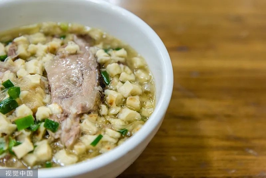 在盛满热汤的大瓷碗里