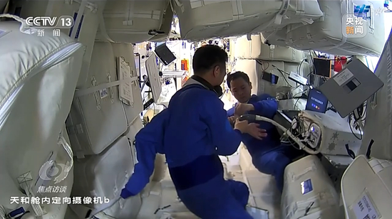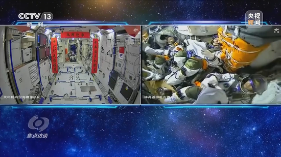 从地面启程不到9个小时,神十六乘组就抵达了中国的太空之家。新航天员第一次进入核心舱,值班半年的老队员细心地带着他们慢慢活动,适应太空环境。在精心布置的空间站核心舱,六名航天员激动地分享着见面的喜悦。