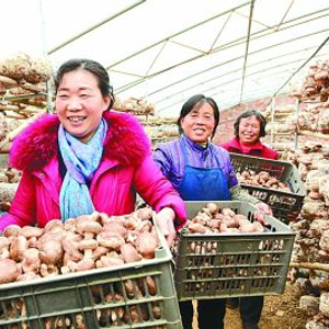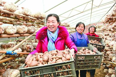 郧阳区青山镇驻村工作队队长王燕(前)帮助贫困户收获香菇。周家山摄/光明图片