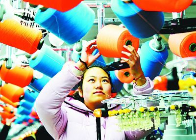 郧阳袜业工人熊彦珍正在安装织袜彩线。周家山摄/光明图片