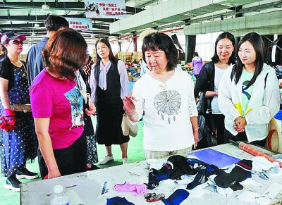 作者韩小蕙(中)在郧阳袜业扶贫车间厂采访。周家山摄/光明图片