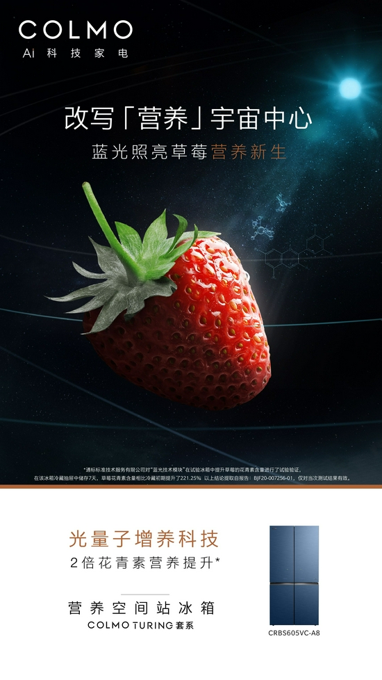 这台COLMO冰箱搭载光量子增养科技,以450mm蓝光直达细胞内核,提升合成花青素关键CHS酶活性,使草莓、橙子、车厘子等水果7天两倍花青素营养提升。还有AI抑嘌呤科技,让舱内生鲜嘌呤含量降低41%,可以让用户安心享用更多海鲜珍味,有效降低健康隐患。