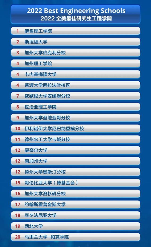 学院整体排名没有太大变化,TOP 3仍然被三大名校麻省理工学院、斯坦福大学、加州大学伯克利分校占据,康奈尔大学上升至第12位。USNGE国际友好大学——路易斯安那州立大学石油工程专业则仍然位居全美第10位;犹他大学核工程则位居全美12位。