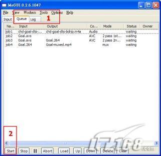 返回MeGUI主菜单的Queue,工作次序已排列在菜单内,按Start键就开始编码工作了,请耐心等候,编码所需时间要时视乎主机能性。