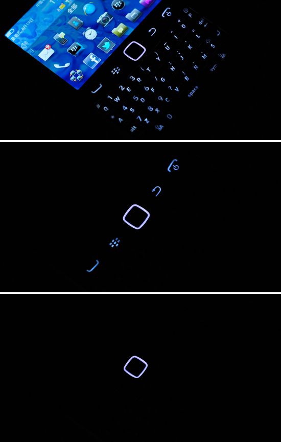 还需要特意指出背光灯的一个特点,触控板、黑莓键、键盘区的背光熄灭并不是同步的,在光线明亮的环境下,先是键盘区灯光熄灭,而后是黑莓键,最后才是触控板背光消失,具体这样的设置为何我们不得而知,但是效果很出众。而且相比此前拨号键以及挂机键的红绿面板设置,此次统一均呈现了白色背光。