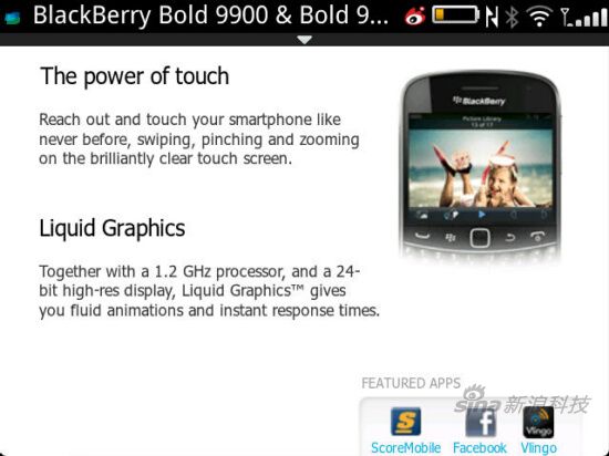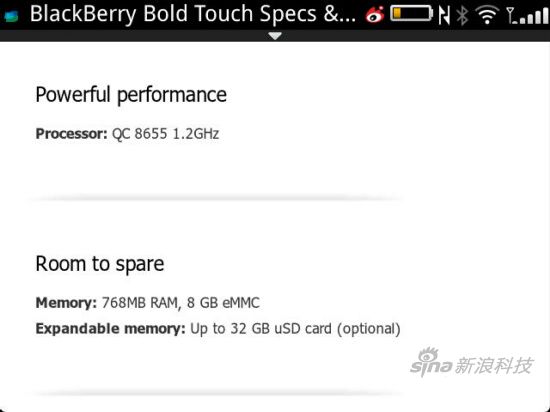 浏览器:RIM官方称BlackBerry 7 OS的浏览器速度比6快1.6倍,并且JavaScript表现业界领先。实际使用时,浏览器对网页的拖动和双指放大操作第一次在黑莓手机上能变得能够流畅进行。