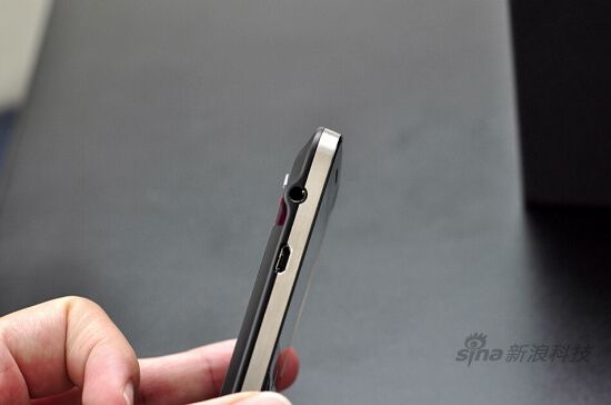 黑莓9900的机身顶部只在正中央设置有电源键,而将原有的静音键挪至了右侧音量调节按键区域,在来电状态下,按电源键可熄灭屏幕并将铃音静音,再次按电源键不仅可点亮屏幕,铃声也随之恢复。底部无多余设计,仅有的两个凸出金属圆点是与充电底座接触所设计。