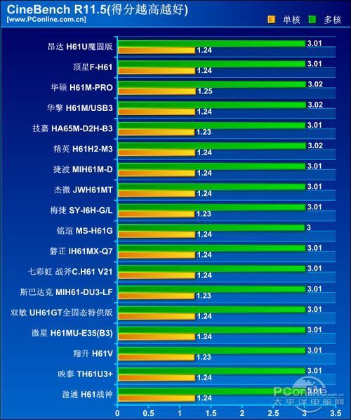 在Cinebench R11.5软件的3D渲染测试中,各款主板都能正常发挥CPU的性能,但是各款产品之间的性能表现也存在一些细微的差别。
