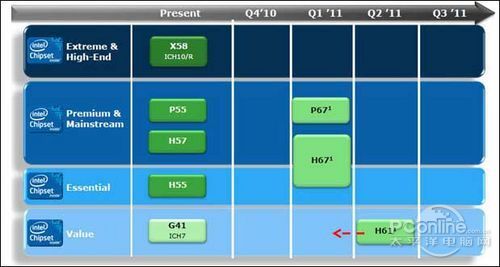 英特尔产品路线图显示得很清楚,P67和H67在1月6日和Sandy Brige处理器一起发布,用来替代目前P55、H55、H57产品;随后Intel将在第二季度发布H61芯片组,用来取代LGA775接口的G41主 板,到时LGA1155将正式一统中高低端产品线。