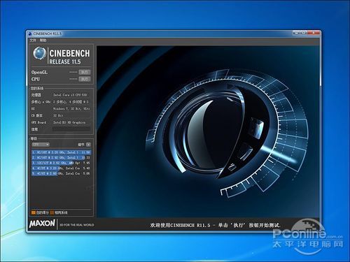 CineBench R11.5为目前最新版的Cinebench系列测试软件,软件采用了全新的评分机制,并对新架构CPU有更好的优化,以更真实地反映CPU的性能。它采 用了3D设计软件CINEMA 4D的3D引擎,支持多线程同时运算,可以用来评测多核处理器的效能。