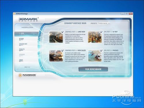 3DMark Vantage主要包括了Graphics Test和CPU Test两个测试部分,它们各自带有两个测试场景,其中Graphic Test包括Jane Nash、New Calico,主要针对显卡的3D图形渲染性能。而CPU Test就包括AI和Physics两个部分,分别测试处理器的AI运算和物理加速性能,在现在的游戏发展中,除了图形3D性能以外AI和物理运算都是游 戏中极其重要的部分,在新的3DMark中对这四项目都进行了测试,无疑更能反映整个平台的游戏性能。