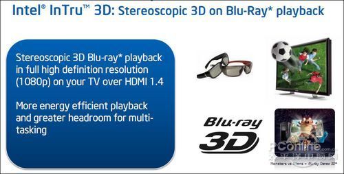 第二代Core i3/i5/i7的核芯显卡支持英特尔InTru 3D技术,这个技术通过最新的HDMI 1.4规范输出,可以让用户观看蓝光3D电影,让用户在家里也能享受更逼真的电影效果。当然,前提是要有3D眼镜和显示器的支持。