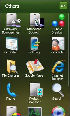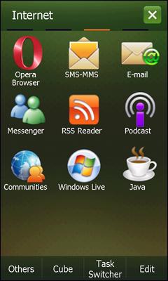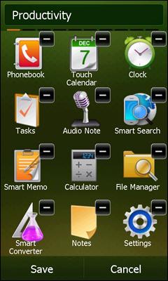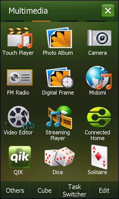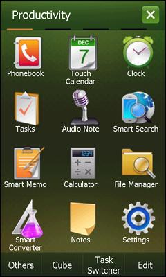 传统的12宫格功能界面也作出了重大改革,主要的程序和工具按照Productivity、Multimedia、Internet、Office四大应用领域划分为四大类,共计四页30余项。这30余个功能图示基本涵盖了绝大多数最常用的应有和功能,使得用户在使用时不必进入二级菜单寻找,简化了操作。