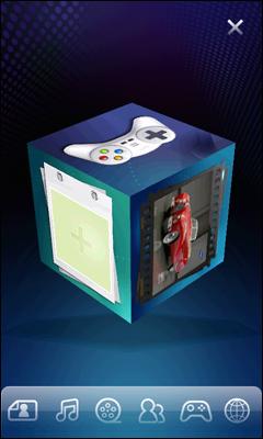 而最最炫目的一点改进,就是3D魔方操控界面Cubic 3D的加入。点击Cube,一个转动的魔方便会跳出来,相册、音乐、电影、联系人、游戏、互联网六大主要功能分别放置于魔方的一个面上,魔方可以自由转动,方便在六个功能中迅速切换。当需要启动其中一项功能时,点下方块的一个面或者点击下方的快捷键即可。