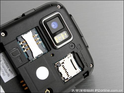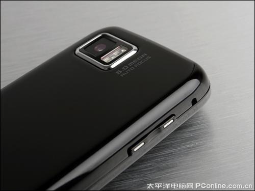 再看背面,I8000U将在后壳上方放置了一颗500万像素的主摄像头,而将扬声器和话筒很低调地隐蔽在下方,很好地保证了机身外观上的整体性不被破坏。