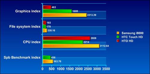 上图的结果可以看出,800Mhz主频的CPU和256/512MB的内存组合果然大不相同,我们从Spbenchmark的测试结果可以看到,I8000U无论是在总体表现还是在各自子测试项目中,都大大领先于其他两台机器,而在CPU性能子项和图形性能子项中,这一领先优势尤其突出。