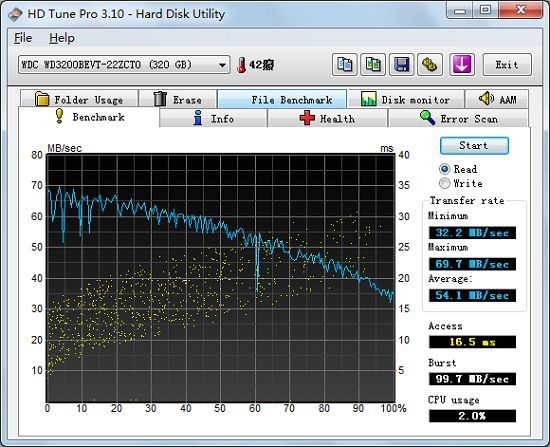 我们收到的这款样机采用了西部数据WDC WD3200BEVT 2.5英寸硬盘,这块硬盘的容量达到了320GB,同时转速也达到了主流的5400转,这块硬盘支持SATA-II接口,可以有效的配合ICH9M南桥达到更快的3.0Gbps传输速率。