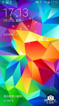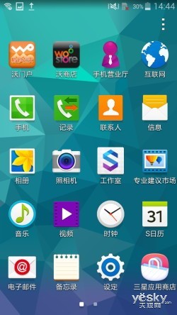 主屏幕上方是一个小窗口的设计,里面放置有时间、日期和天气情况,下方是几个最常用的程序,如短信、电话、联系人、微博微信等等,这些都可以依据个人喜好手动调节。因为上下窗口设计、搜索条、应用程序的设计依据大小轻重的不同排列有序,所以尽管一个页面放置的东西很多,但不会让人觉得乱,和而不同。值得一提的是,三星的系统界面色彩饱和度一般都做的饱和度很高,靓丽活泼,灵动,提升视觉体验。