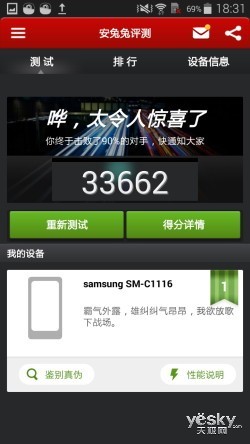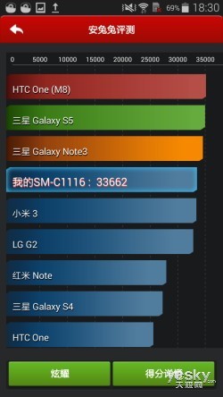 一般提到硬件性能,都会用跑分做参考。在安兔兔跑分软件中,三星GALAXY K zoom 得分33662,表现不错,仅次于目前市面上几款顶级旗舰机型,CPU性能较好,能运行并同时运行多个软件,玩大型游戏也基本没有问题。此外,三星GALAXY K zoom 运行内存达到2GB规格,配备2430mAh容量电池,并具备超级省电模式等独创功能。整体而言,三星GALAXY K zoom 硬件方面还是无需担心,可以放心使用的。