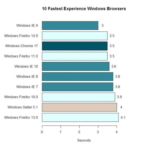New Relic这次测试并非是单纯根据测试软件跑分,而是参考了全球50亿次网页读入的综合速度,结果显示在Windows和Mac上等,此次参加Windows系统的浏览器有IE7、IE8、IE9、IE10、Firefox 11、Firefox 13、Firefox 10、Firefox 14、Chrome 17和Safari 5.1。测试结果显示IE9是读取速度最快的浏览器,平均单页读取时间3秒,要高于Firefox 11甚至是Chrome 17。