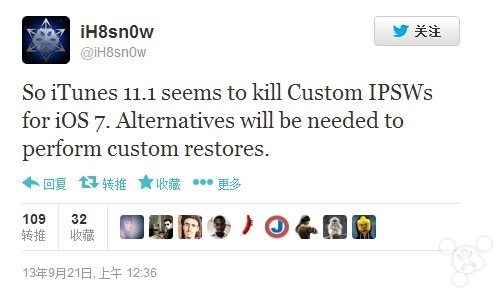 本周初在 iOS 7 正式发之后,苹果很快就更新了 iTunes 11.1,新增了多个重要功能,包括 iTunes 广播、Genius 随机播放、与 iOS 7 同步等。不过根据著名黑客 iH8Sn0w 在推特中的最新更新,苹果在 iTunes 11.1 已经禁止恢复 iOS7 的 IPSW 自制固件。