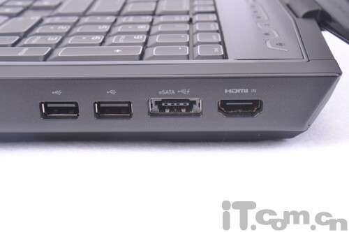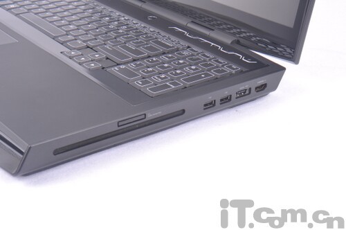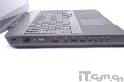 Alienware M17x R3的机身接口布局较比M17x R2进行了重新布局,拥有多合一读卡器和RJ-45网线接口,支持VGA视频输出,HDMI输入输出以及Mini Display Port。另外,拥有双USB3.0接口、双耳机音频接口以及吸入式DVD光驱(可选配蓝光),这些丰富接口足以满足游戏玩家任何正常需求。