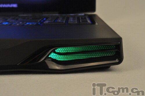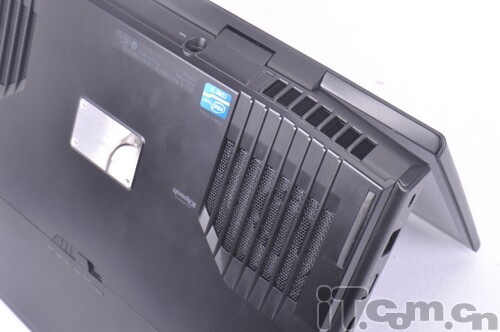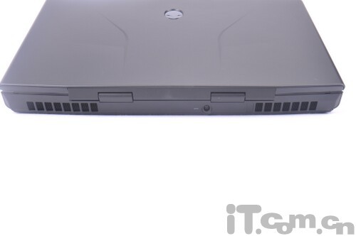 Alienware M17x R3散热器出口被设置在了笔记本后面及背面。从外部可以看到Alienware M17x R3采用了双风扇散热。具体散热效果笔者将在机器拆解中进行说明。