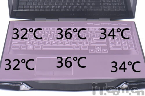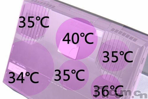 对于散热Alienware M17x R3提供了4个散热出口,两个顶级散热风扇分别针对显卡及处理器进行散热疏导,显卡配置了3条铜管散热,处理器配置了2条铜管进行散热疏导。经过10小时3D游戏运行实测 M17x R3表面温度较为理想具体温度数值如下。