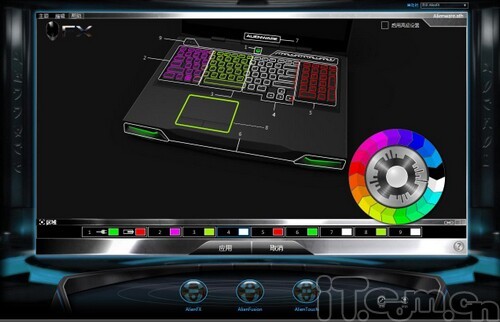 外星人最经典的设计莫过于炫彩背光效果,通过内置的AlienFx驱动软件(M17x R3功能键最右侧的按键可以调出该软件)用户可以随意选择笔记本不同位置的发光颜色,正是因为外星人的这一个特性,众多国内外知名的DJ都很青睐外星人笔记本。