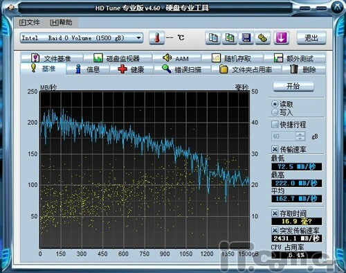 看来以上的系统测试是不是觉得硬盘拖累了整机的后腿呢?实际上硬盘的表现也非常不错,Alienware M17x R3硬盘由为两块希捷750G 7200转硬盘组成,其在磁盘性能测试中表现优秀,平均读取速率达到了162.7MB/s非常不俗。