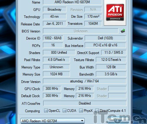 GPUZ显示结果Alienware M17x R3内置AMD Radeon HD6870M显卡,位宽128bit,1GB显存。