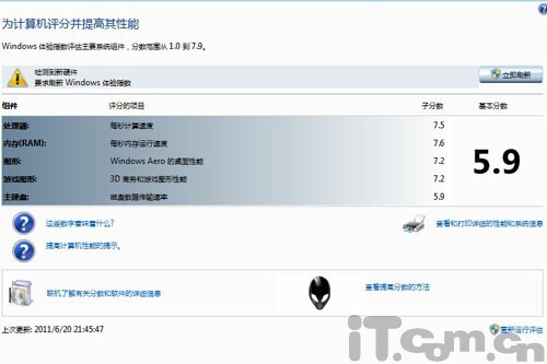 Windows7对于M17x R3的评分非常卓越,尽管综合分数仅有5.9分,但是除了硬盘打分以外均达到了7分以上。