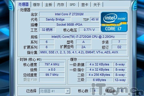 CPUZ显示结果中可以看到酷睿i7 -2720QM处理器的相关信息,主频2.2GHz四核八线程支持睿频加速。酷睿i7 -2720QM属于目前笔记本产品中顶配的处理器,性能卓越可以应付大多数处理需求。