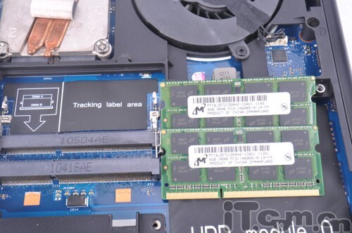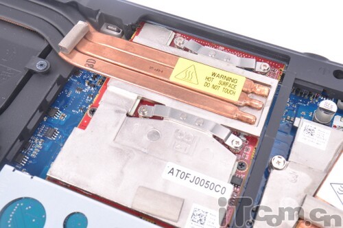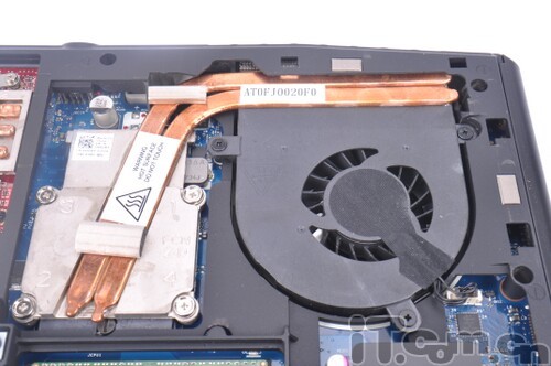 取下Alienware M17x R3的背壳我们可以清晰的看到内部配置布局的全貌,图中上部为单显卡及处理器分别设有3跟及2跟铜管进行散热引导,并且配置了双散热风扇。