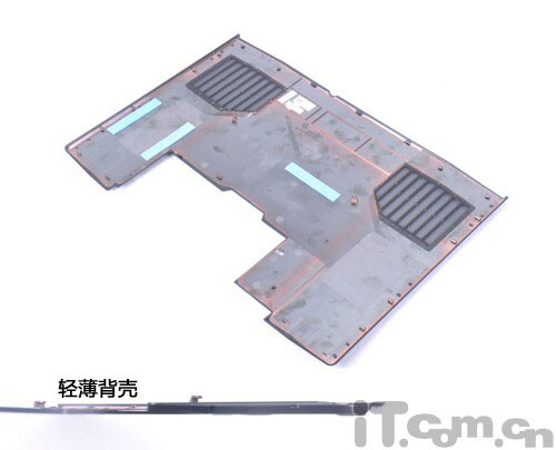 Alienware M17x R3的背壳极其轻薄并且柔韧,上图为背壳实际的厚度,也许很多网友不相信,但是Alienware M17x R3的背壳真的就是如此的轻薄,当然轻薄的背壳使得其散热效果更好一些。