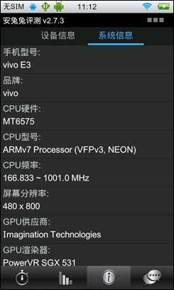 在系统硬件方面,步步高vivo E3搭载了一颗MT6575,A9架构,频率为1GHz的处理器,配置了512MB和4GB的运行内存和机身内存,另外还集成了PowerVR SGX 531的GPU,整体硬件规格非常主流,足以应付系统日常运行和带来较好的游戏体验。我们来看一下步步高vivo E3的各项系统性能指标表现如何。