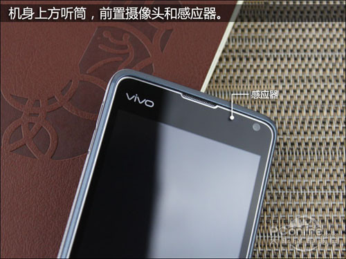 在步步高vivo E3的机身上方是金属网状听筒,质感不错,并且采取内嵌式设计,优点是能有效地避免刮伤听筒,但缺点就是比较容易积累灰尘,算是各有优劣。听筒左下方是步步高vivo系列手机的LOGO。而在听筒右侧则是光线距离感应器和30万像素的前置摄像头,但步步高vivo E3并没有配备通知灯,可能会有些不方便。