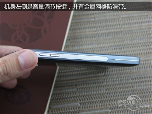 在机身左侧是音量调节按键,并且在机身周边加入了金属防滑带,因此摸上手时手感很好而又不容易滑手,防滑性能很不错。