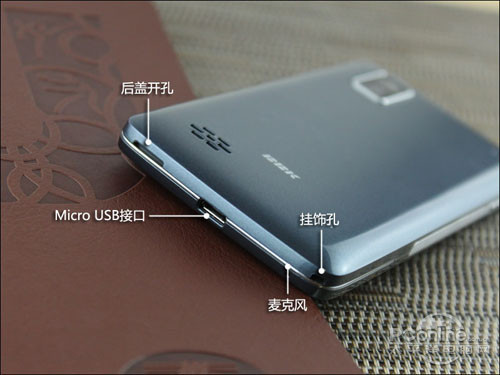 步步高vivo E3的机身底部设置较为丰富,分别有后盖开孔,数据线接口,通话麦克风还有一个贴心的挂饰孔。