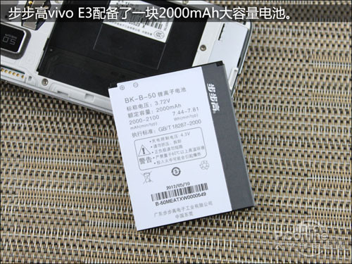 在摄像头方面,步步高vivo E3拥有一颗500万像素支持自动对焦的摄像头,机身正面还有一颗30万像素的摄像头,但遗憾的是步步高vivo E3并没有配备闪光灯。另外,步步高vivo E3的整体机身尺寸也控制得非常好,整机厚度仅有10.5mm,非常纤薄。在电池方面,步步高vivo E3配备了一块2000毫安时的大容量电池,相信在电池续航方面会有不错的表现。