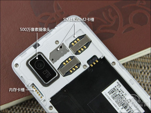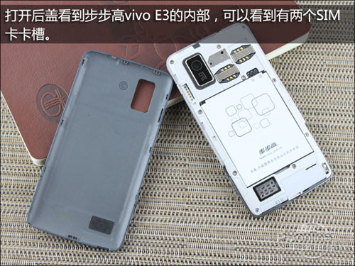 步步高vivo E3的内部上方是两个SIM卡卡槽,分为SIM1和SIM2,分别支持GSM和WCDMA网络。
