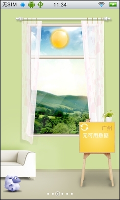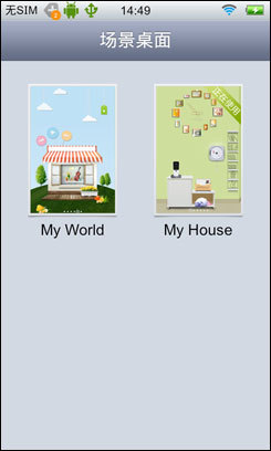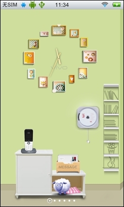 在步步高vivo E3中用户有两种用户界面可供选择,一种是传统的桌面模式,另外一种就是这种可爱清新风格的场景模式。步步高vivo E3有两种可爱的场景模式my world,my house供用户选择。在场景式UI中可以分为6个分屏,每个分屏上都有对应的插件,如时钟,桌面天气,一些应用程序等,而且这些插件都比较可爱,女性用户一定爱不释手。
