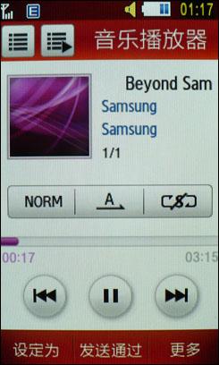 尽管三星S5230定位于中低端,但是其具备的多媒体娱乐功能还是比较主流的。内置的音乐视频播放器支持MP3、AAC、AAC+、WMA、eAAC+、WAV等常见的音乐格式,内置RDS FM收音机、DNSe数位环场音效,也支持H.264、H.263、MP4和WMV视频的播放。我们使用高码率的MP3来进行外放试听,把音量开到最大,效果一般,不会很响亮,声音显得有点单薄,穿透力不够,这与没有采用独立的扬声器有关系。